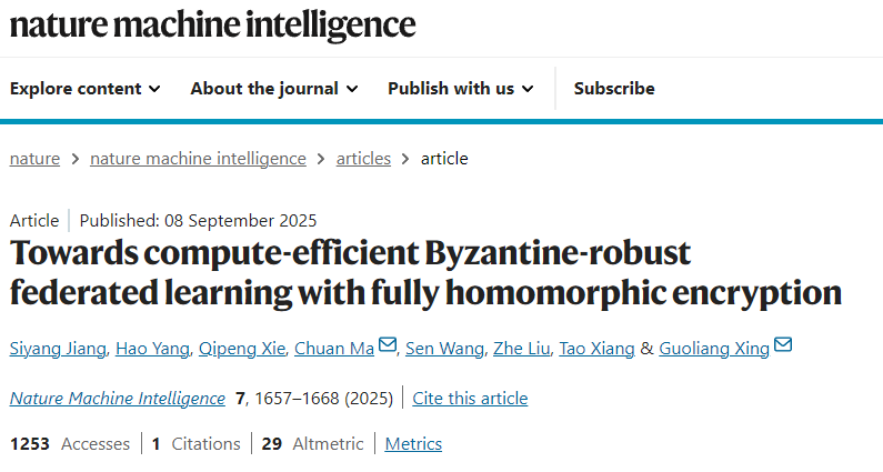 近日,重庆大学计算机学院马川副教授与香港中文大学邢国良教授团队合作的研究论文“Towards Computed Efficient Byzantine-Robust Federated Learning within Fully Homomorphic Encryption”在Nature子刊《Nature Machine Intelligence》上发表,马川副教授担任第一通讯作者。《Nature Machine Intelligence》是人工智能与机器学习领域的顶级期刊,影响因子为23.9。该论文提出并实现了兼具全同态加密(FHE)与拜占庭鲁棒性的联...