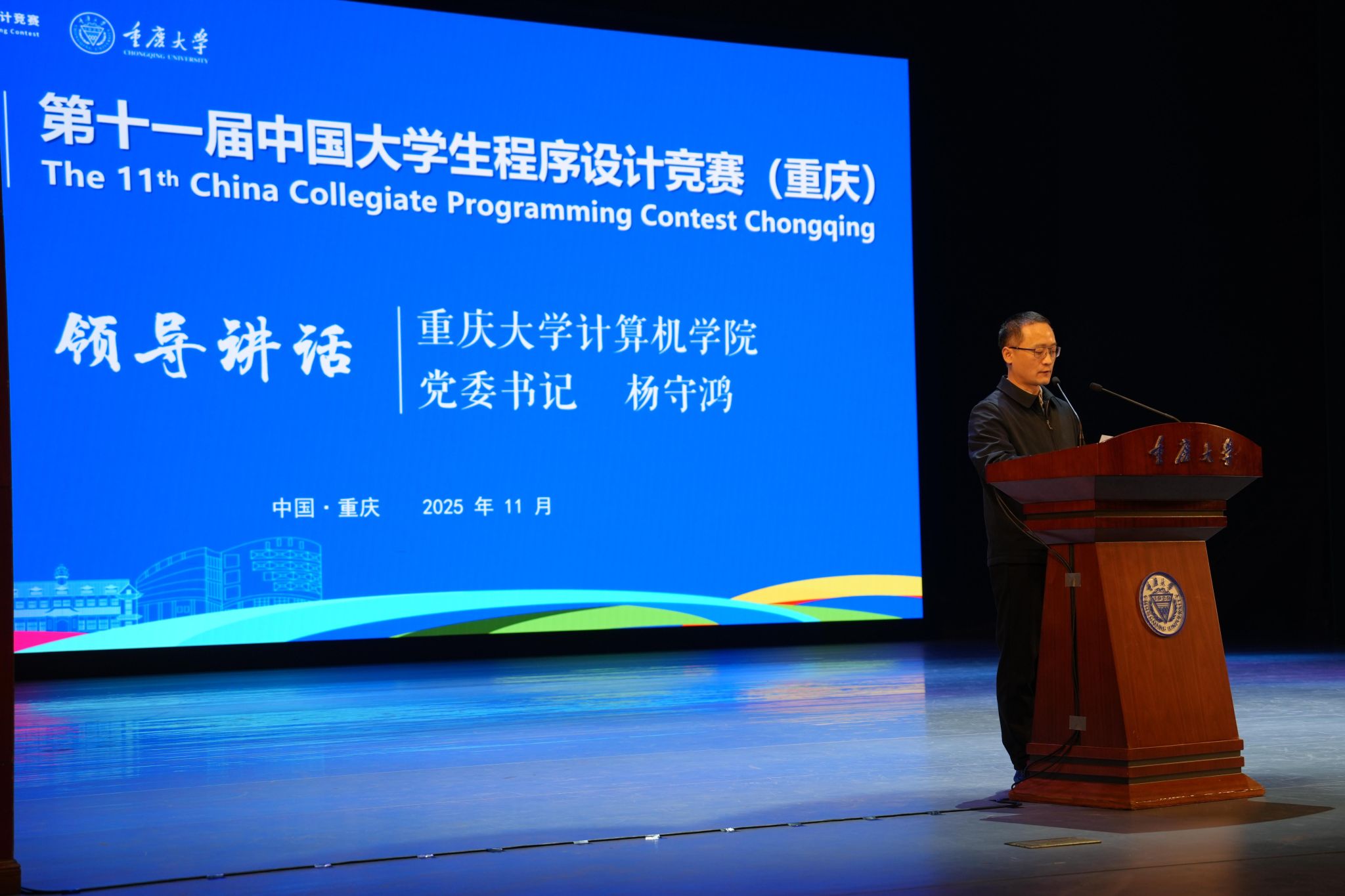 开幕式上,重庆大学计算机学院党委书记杨守鸿致欢迎辞,向远道而来的全国参赛选手表达了诚挚的欢迎与深切的期望,鼓励同学们在比赛中尽情挥洒才华、挑战自我,勇攀高峰、斩获佳绩。