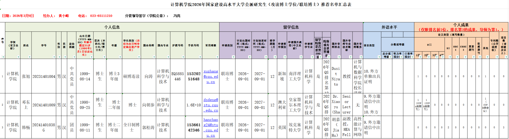 根据2026年国家建设高水平大学公派研究生项目文件要求和学校的工作部署,计算机学院组织成立2026年国家公派出国留学项目评审工作小组。评审小组按照2026年国家建设高水平大学公派研究生项目指南和各项申请材料要求,对申请人的资格、思想品德、综合素质、发展潜力、出国留学必要性、学习计划可行性及身心健康情况等方面进行评审、考察,择优推荐,具体情况如下: