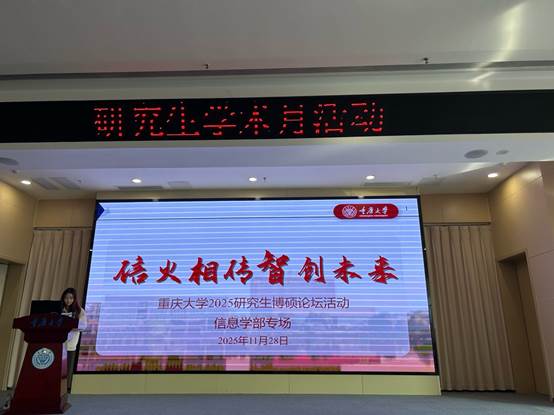 11月28日下午,重庆大学虎溪校区信息科研楼A805报告厅内座无虚席,一场思维碰撞的学术盛宴——“‘信’火相传·智创未来”2025年研究生博硕论坛在此隆重举行。本次活动作为研究生学术活动月的重要组成部分,由自动化学院、微电子与通信工程学院、光电工程学院、计算机学院及软件学院五院联合筹办,旨在打破学科壁垒,通过优秀朋辈的经验分享,为广大研究生点亮科研与职业发展的引路明灯。