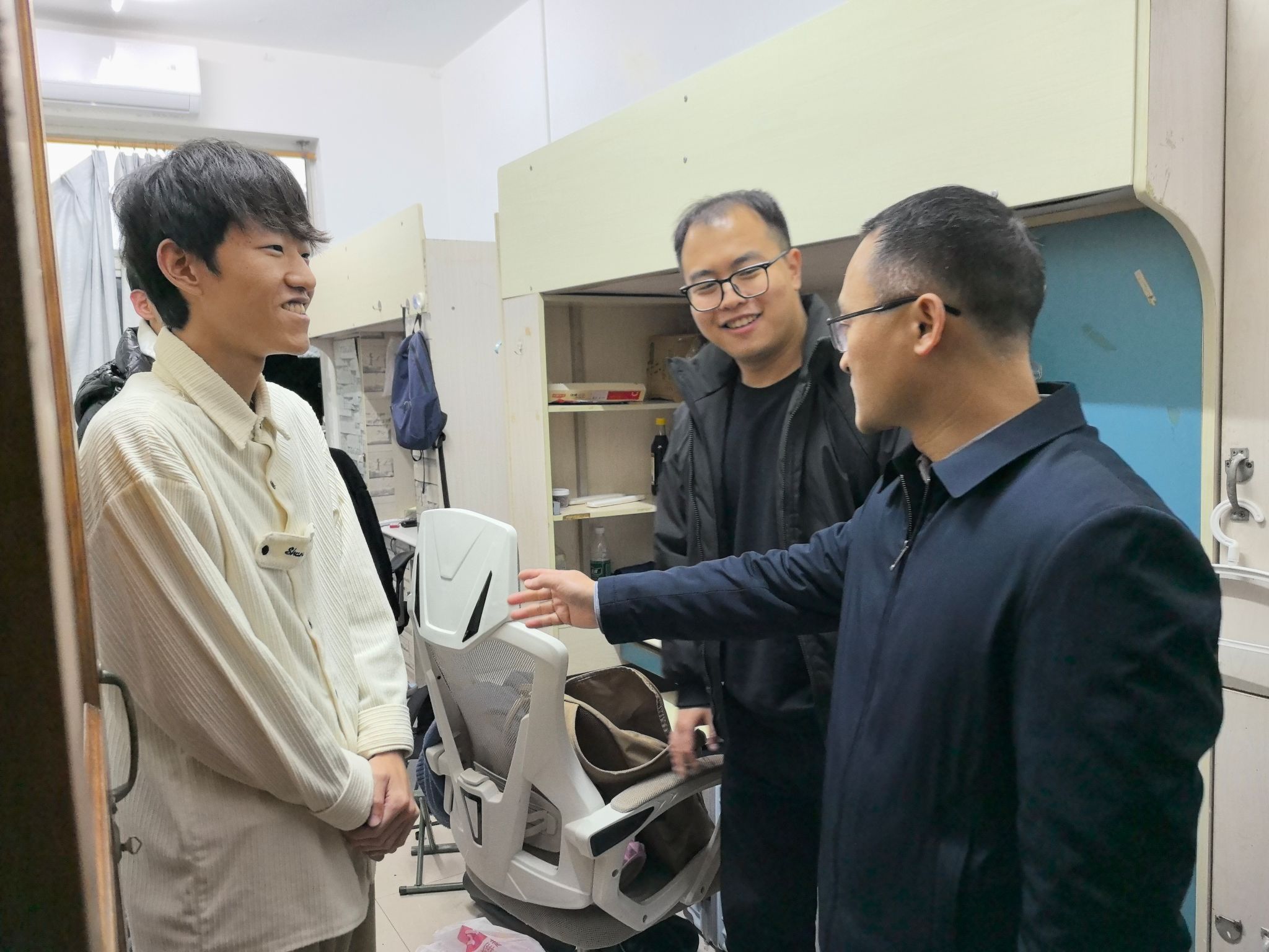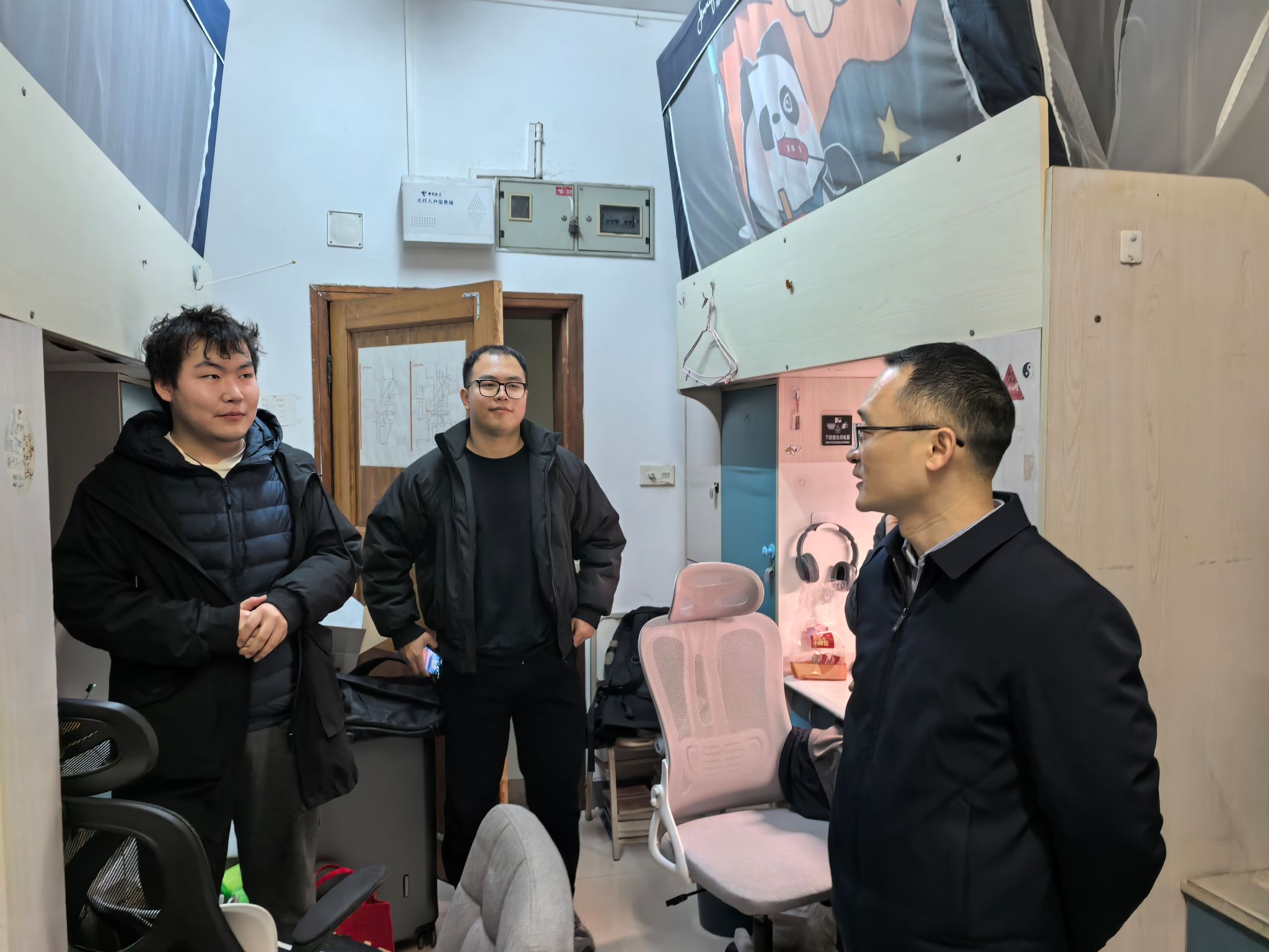 走访过程中,杨守鸿落实领导班子“结对子”联系学生机制,专门走访了对接的学生寝室。在对接寝室,与同学们进行了面对面的深入交流,详细询问了同学们的期末备考进展、生活中存在的实际困难等,并鼓励作为学生干部的同学要主动联系身边同学,及时向学院反馈同学们的意见建议和共性需求。