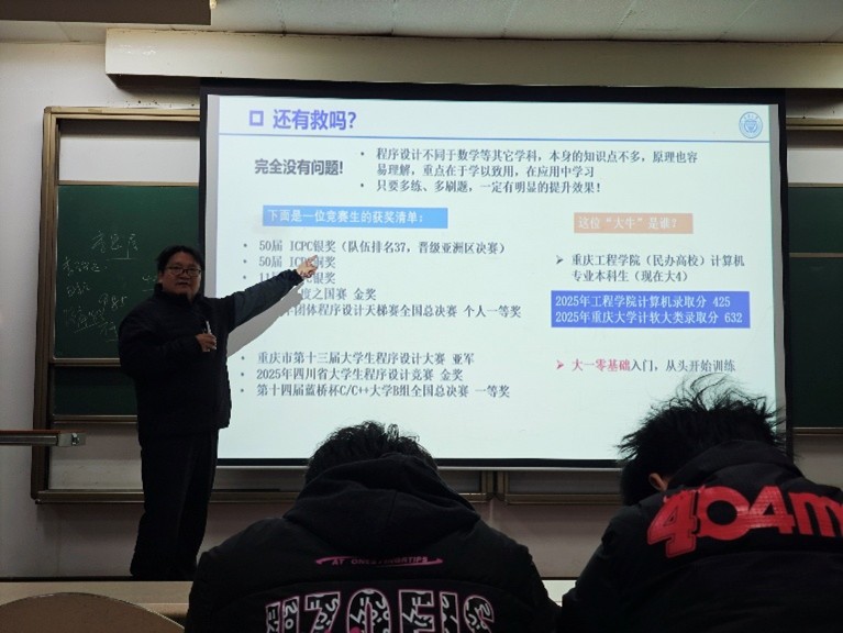 随后,竞赛指导老师李佳为同学们带来了一场干货满满的竞赛与编程学习分享。他指出,程序设计学科重在学以致用,多练多刷是提升能力的关键,并以优秀学生为例,展示了坚持训练带来的显著成果。以此激励同学们以优秀学子为榜样,积极参与学科竞赛,在实践中锤炼编程技能、提升专业素养。