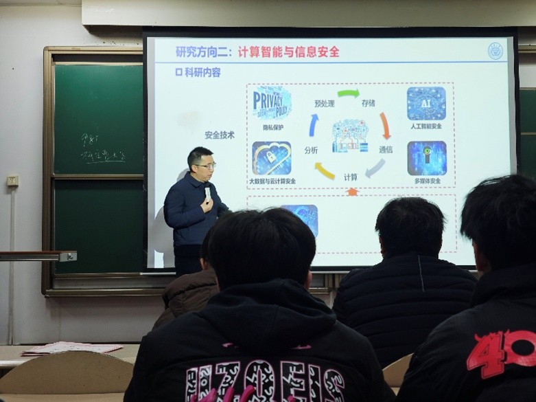 会上,学院副院长郑林江率先发言,围绕学院基本情况、课程设置及核心研究方向展开详细介绍。他重点解读了“计算智能与信息安全”这一核心研究方向,从安全技术、大数据与云计算安全、人工智能安全、多媒体安全等维度,梳理了科研内容与实践路径,让同学们清晰了解学院的学科优势与发展布局,为大家明确专业学习目标、规划未来发展方向提供了重要指引。