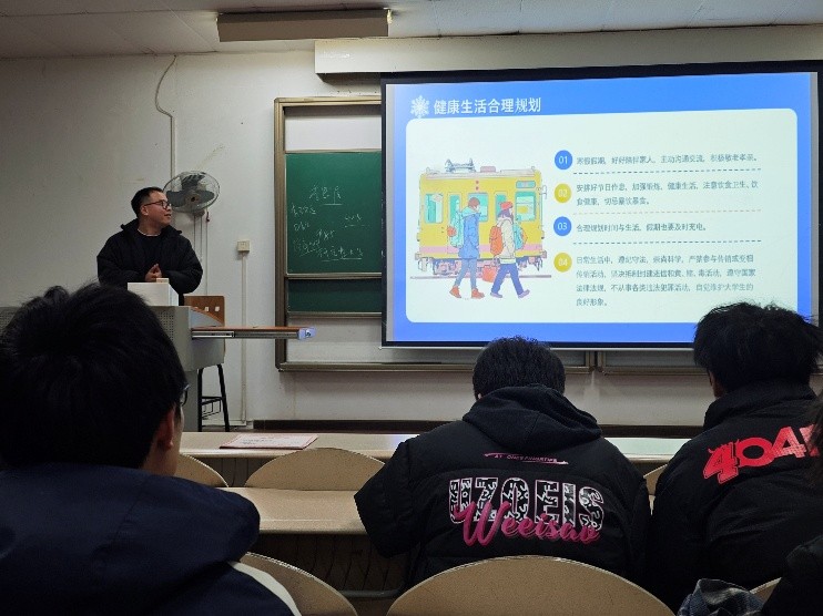 最后,辅导员文悠然聚焦假期安全与生活规划,开展了专题安全教育。他从陪伴家人、作息管理、学业充电、遵纪守法四个方面,详细讲解了寒假期间的健康生活与合理规划要点,强调要加强锻炼、注意饮食卫生,坚决抵制各类违法违规活动,自觉维护大学生良好形象,为同学们度过安全、充实、有意义的假期筑牢思想防线。