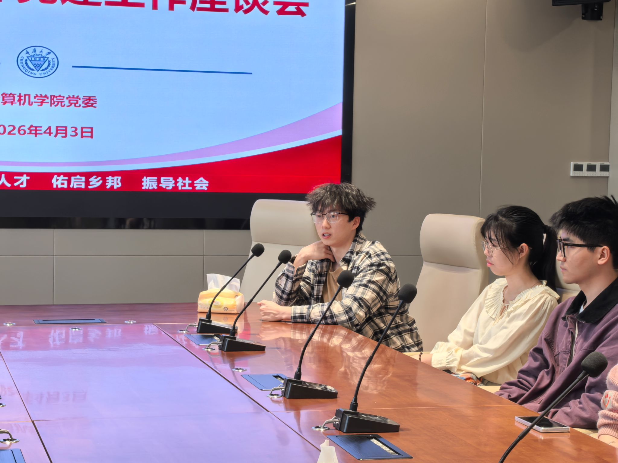 为深入推进研究生党支部建设,切实提升研究生实验室管理服务水平,4月3日上午,计算机学院党委在信息大楼B409会议室召开研究生党支部党建工作座谈会。学院党委书记杨守鸿主持会议,全体研究生党支部委员、研究生辅导员及学院党委组织员参会。